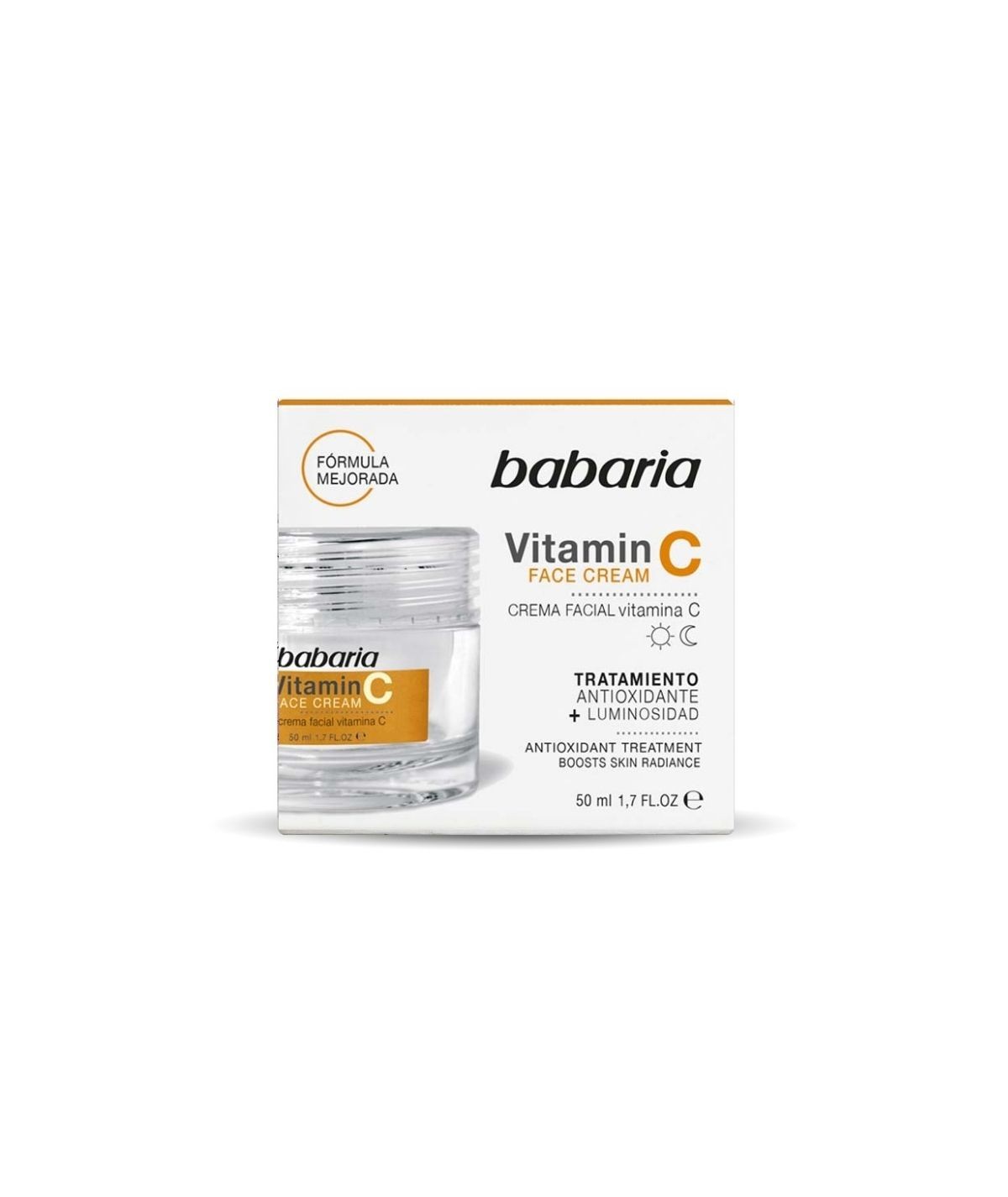 Crema facial Babaria Vitamin C. Posee activos derivados de la vitamina C, Vitamina Em Squalano y filtro solar. Funciona como tratamiento antioxidante y aporta luminosidad. La crema facial Vitamina C ha sido diseñada utilizando la combinación de un activo innovador derivado de la vitamina C y la vitamina E, que por su poder antioxidante se consigue un aumento en el brillo de la piel, aportando luminosidad. Protege frente a la luz azul proveniente de los dispositivos móviles y frente a la polución. Babaria recomienda la crema facial Vitamina C para personas de todas las edades y para pieles grasas. Para un efecto más eficaz utiliza la crema junto al Sérum de vitamina C Babaria, añadiendo unas gotas junto a la crema.
