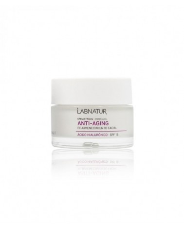 Crema anti edad facial de Labnatur. Proporciona a tu piel hidratación profunda y equilibra la pérdida de humedad. Aporta firmeza, luminosidad y textura. Lucirás una piel más joven y sana que nunca. Ideal para piel sensible, mixta y/o madura. Reúne las propiedades de los principios activos del ácido hialurónico y protección solar SPF 15. El ácido hialurónico reduce visiblemente las arrugas, aumenta la elasticidad de la piel, estimula la producción de colágeno, previene y rellena las arrugas, reconstruye las fibras que sostienen los tejidos de la piel, y atrae y retiene el agua de la dermis. Producto natural y vegano. Sin alérgenos ni parabenos. Envase de vidrio 100% reciclable. Testado dermatológicamente.