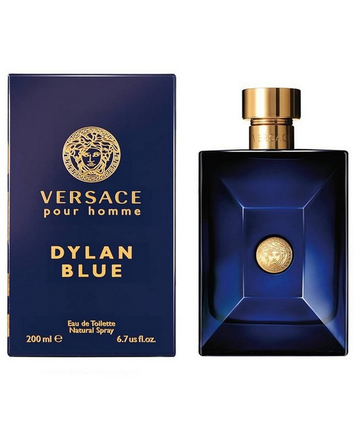 Dylan Blue pour homme de Versace, se presenta en una botella azul y geométrica, enriquecida con detalles dorados, que evoca el mar Mediterráneo y la arena.