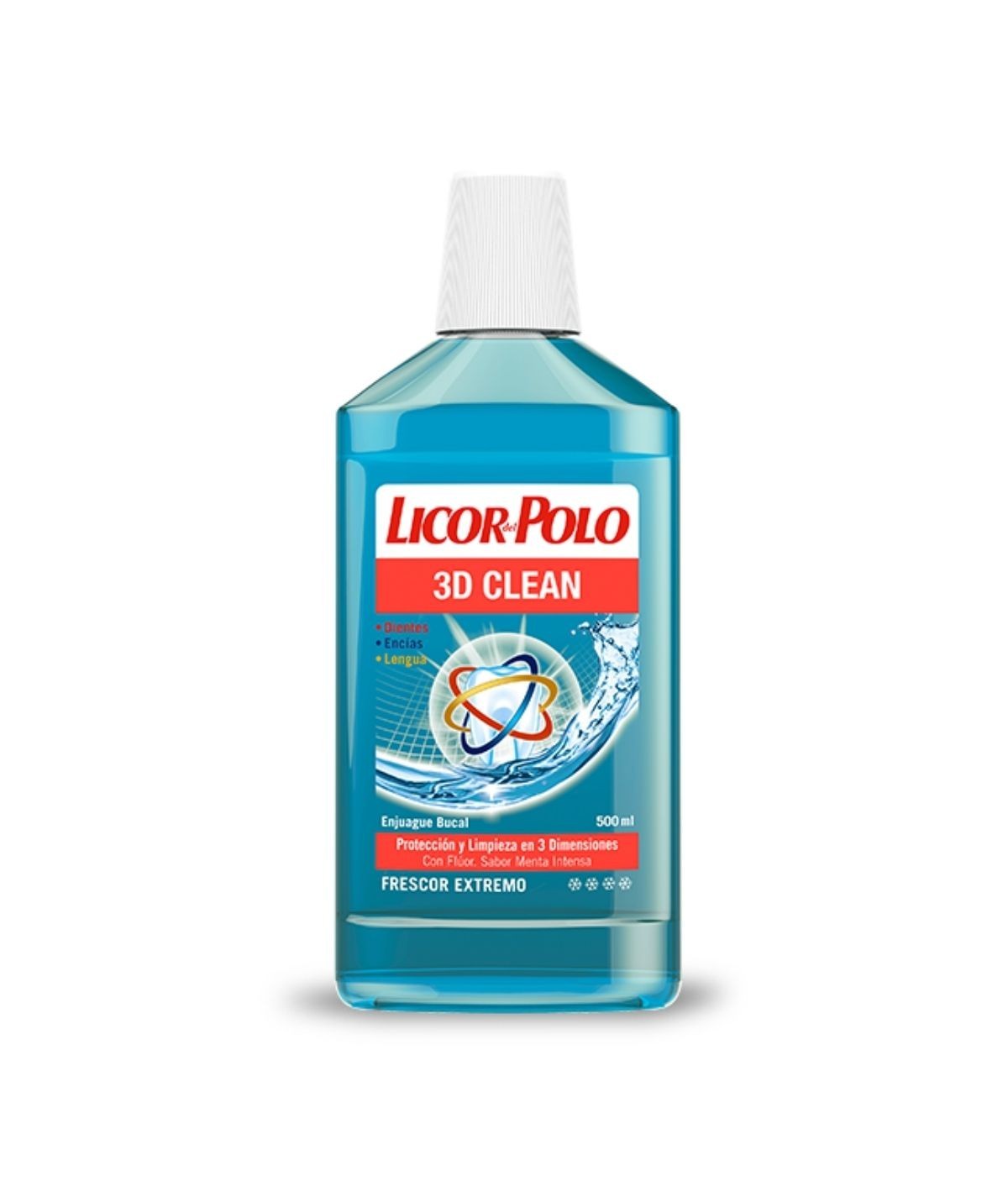Enjuague bucal 3D Clean de Licor del Polo. Ofrece una higiene y protección completa en las 3 dimensiones de la boca: los dientes, las encías y la lengua. Combate las bacterias causantes de las caries, el mal aliento y la placa, aportando a su vez frescor, para una sensación fresca y limpia durante mucho más tiempo con el uso regular. Gracias a su fórmula remineralizante con flúor, ayuda a fortalecer los dientes y a prevenir las caries. Sabor a Mentol Intenso, aporta frescor extremo. Ideal si quieres una limpieza en 3Dimensiones y un sabor intenso!