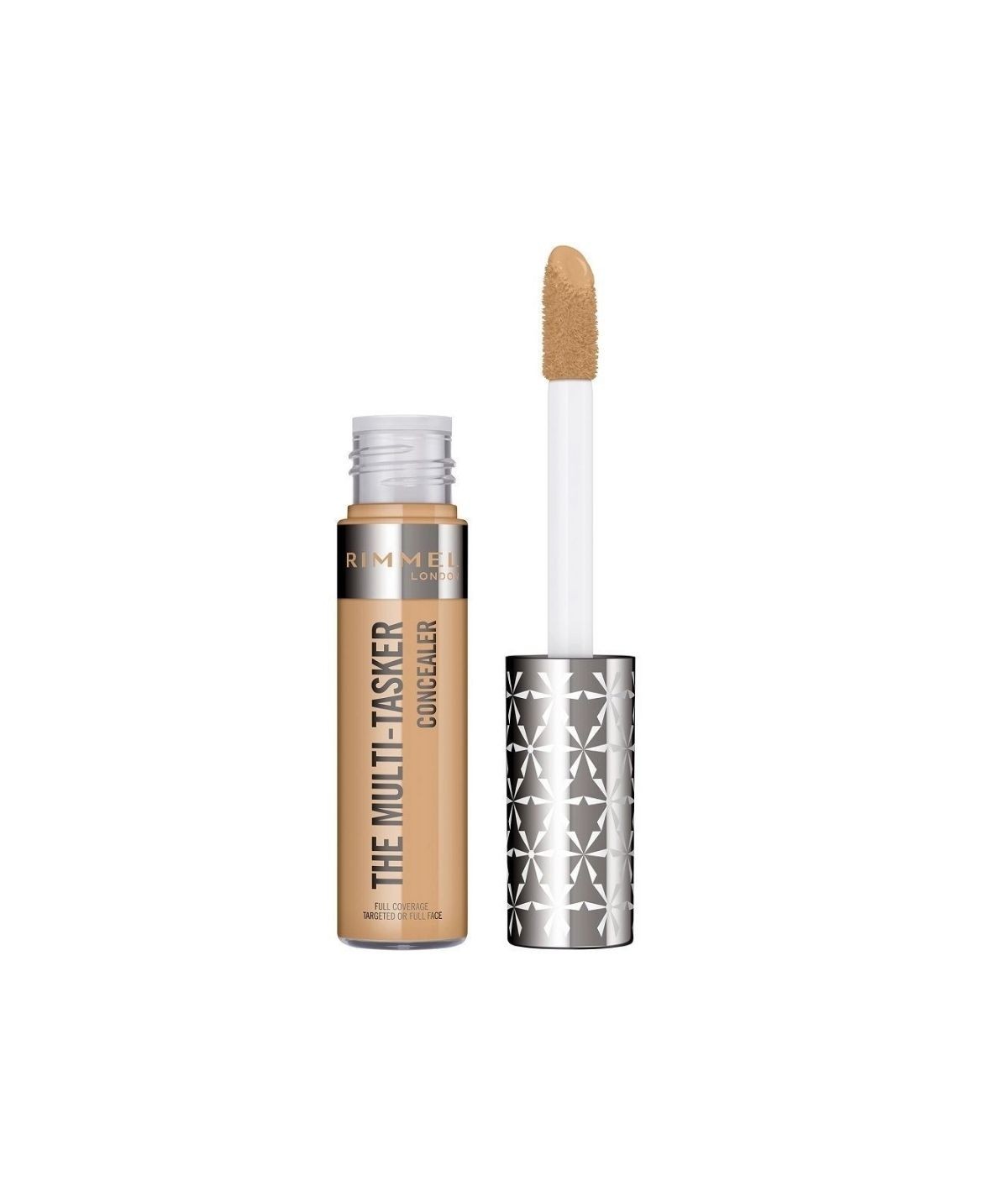 Corrector de ojeras Rimmel Multi Tasker Concealer. Aporta luminosidad y un aspecto con menos fatiga de manera instantánea. Su cobertura dura todo el día gracias a su fórmula cremosa y de larga duración, que cubre las imperfecciones y las ojeras. De acabado natural, el corrector líquido Multi Tasker es ligero, no engrasa, no mancha, ni apelmaza ni crea escamas. Su aplicador facilita una aplicación sencilla, precisa y rápida. Cobertura alta, cubre perfectamente las imperfecciones dejándola suave, uniforme y con luz. Hasta 24 horas de efecto hidratación, a prueba de arrugas, transferencias y waterproof (impermeable, a prueba de agua). Para un correcto uso Rimmel recomienda aplicar con las yemas de los dedos o una brocha correctora, aplicar suavemente y difuminarla para tener un buen acabado; también recomiendan fijar la base con un polvo.