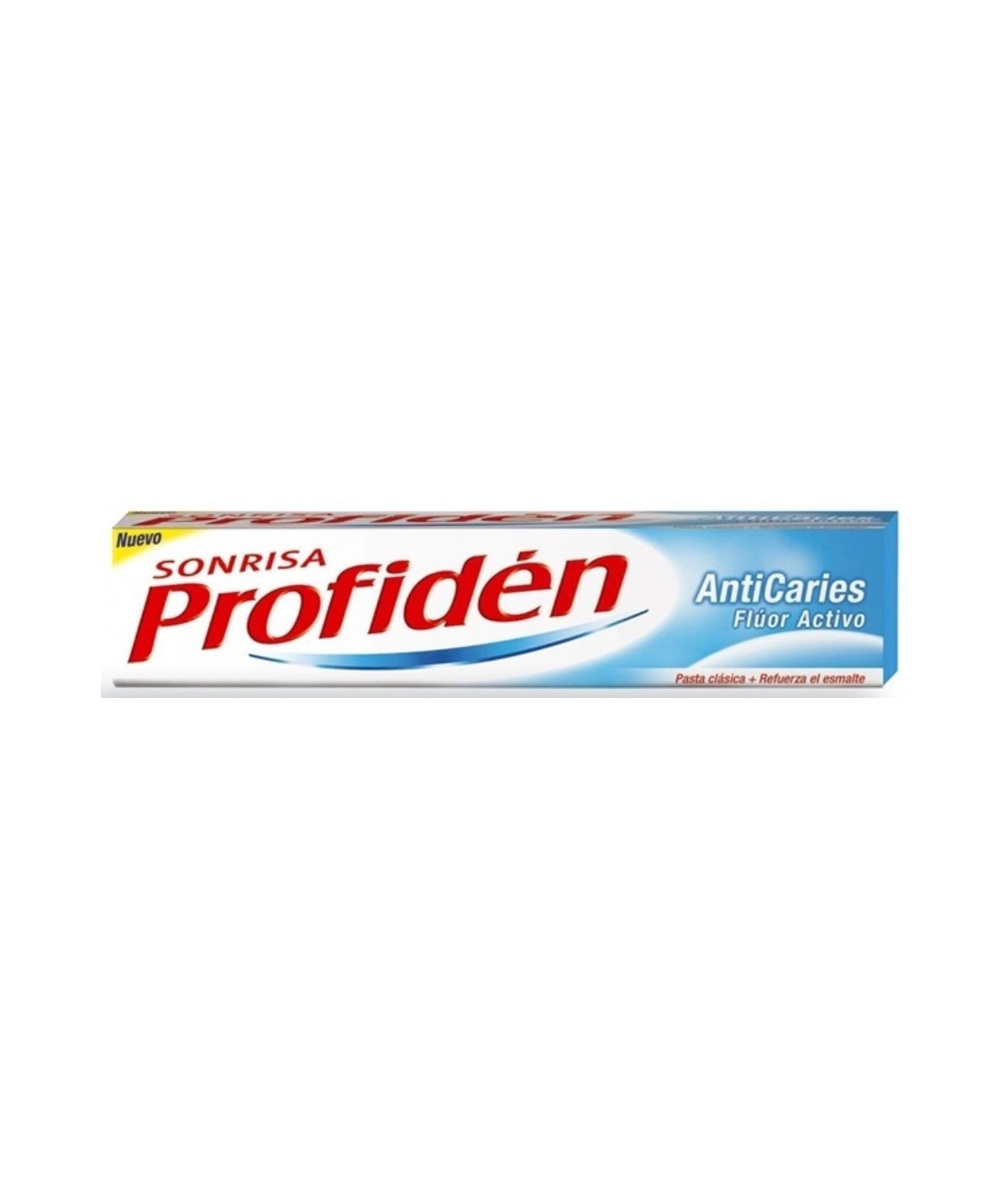 Pasta dentífrico Profidem, con acción anti caries con flúor activo. Esta pasta de dientes clásica refuerza el esmalte de los dientes gracias a su avanzada fórmula con Calcio y Flúor. Refuerza el esmalte de los dientes, y protege de forma eficaz frente la caries, manteniendo así unos dientes más sanos y más fuertes. Luce una sonrisa limpia y fresca.
