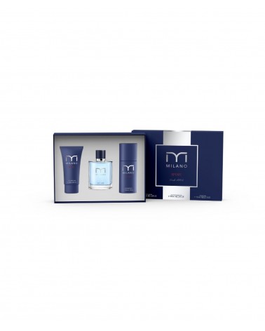 El estuche MIlano Sport contiene: Fragancia Milano Sport 100 ml, Gel de Masaje 100 ml y Desodorante 150 ml.