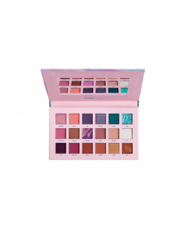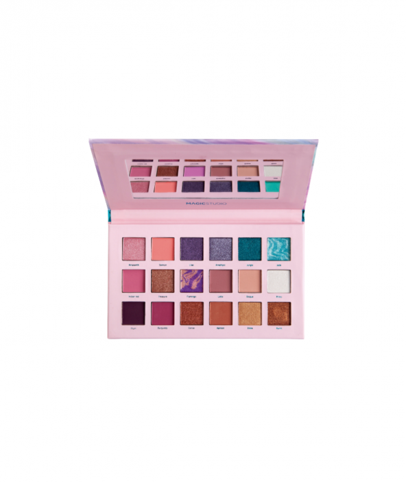Paleta de sombras en tonos pastel de Magic studio, contiene 18 colores extrapigmentados y cremosos con acabados mate o con shimmer. Espejo incluido.
