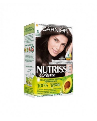 Pelo nutrido, color más bonito. Coloración permanente y nutritiva. Aporta color a tu cabello mientras que lo impregnan de 4 aceites distintos: de aguacate, oliva, grosella negra y karité. Cobertura total de canas, cubre incluso las más rebeldes. Tu cabello queda sedoso y brillante. Garnier Nutriesse Creme ofrece una amplia variedad de colores intensos y radiantes. Imposible no encontrar el color que tanto buscas. Hasta 8 semanas de duración. Embalajes reciclables.
