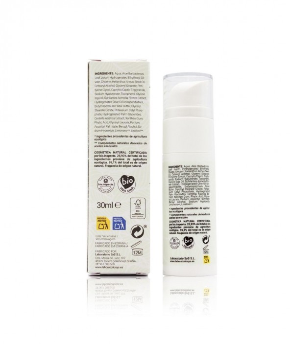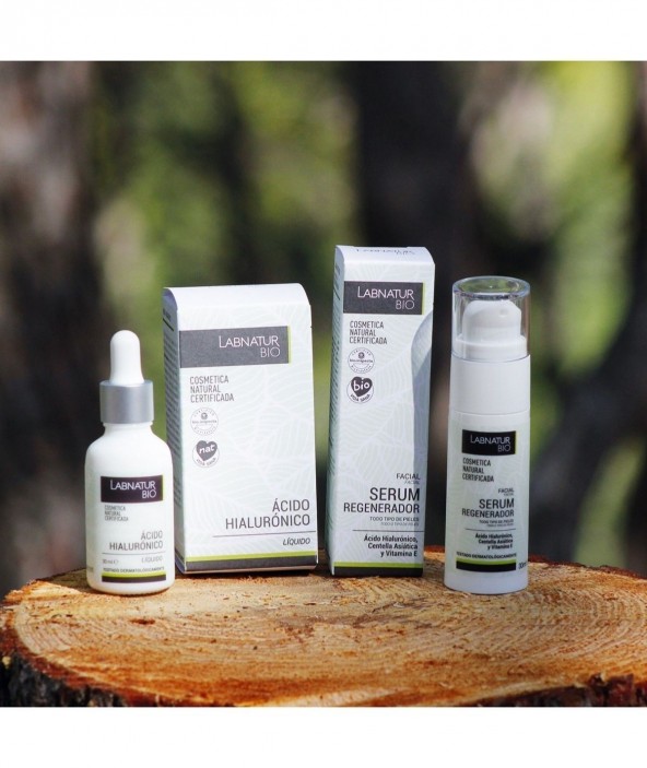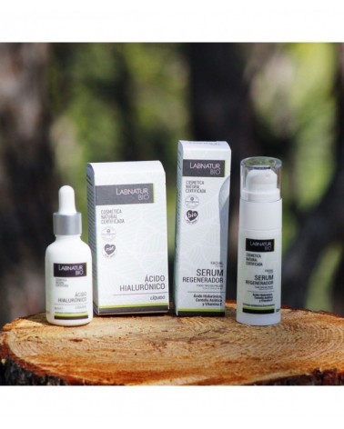 Reduce las arrugas, aumenta la firmeza y revitaliza tu piel con el Sérum facial regenerador de Labnatur Bio. Sus propiedades: El ÁH reconstituye las fibras que sostienen los tejidos de la piel, la Centella asiática estimula la síntesis de colágeno, reafirma y revitaliza. La Vitamina E mejora la acción fotoprotectora y antioxidante. El aloe vera limpia y nutre la piel, además de actuar como regenerador celular, cicatrizante y tonificador. La manteca de Karité hidrata y funciona como anti irritante. Por último, la Acmella reduce las arrugas y reafirma la piel. Su fórmula contiene un alto porcentaje de ingredientes de origen natural, y por supuesto, procedentes de una agricultura ecológica. No contiene parabenos, siliconas, PEG's ni derivados del petróleo. Sin Ingredientes transgénicos o nanopartículas. No testado en animales. No han sido irradiados. Producidos con energías renovables. Testados dermatológicamente. Apta para veganos. Cosmética natural certificada.
